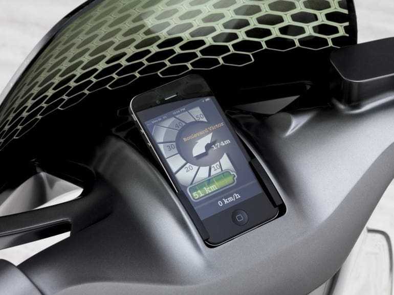 Αυτό το escooter είναι βέβαιο πως πρέπει να έχει και… βηματισμό τεχνολογίας αφού τα smartphone είναι το μεγάλο trend στις φορητές συσκευές. Έτσι μπροστά και στο κέντρο υπάρχει ειδική θέση και όταν τοποθετείται ένα smartphone αυτό συνδέεται πλήρως με το σκούτερ και λειτουργεί σαν το κέντρο ελέγχου και επικοινωνίας της μηχανής. Το smartphone θα λειτουργεί ως μίζα και immobilizer με το escooter να αχρηστεύεται εαν δεν έχει τοποθετηθεί στη θέση της η συσκευή – και αν… το ξεχάσεις στο καφέ;!