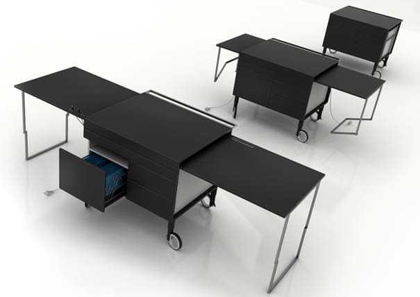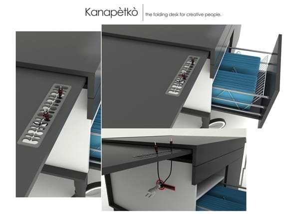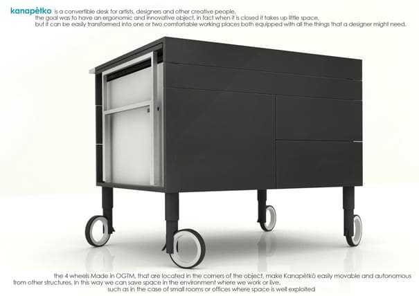 Δεν θα πούμε πολλά αλλά θα αφήσουμε να απολαύσετε το πόνημα του κου Krassi Dimitrov! Μικροσκοπικό όταν είναι κλειστό και με δύο διαφορετικές διαμορφώσεις όταν το χρησιμοποιείς. Έχει τρία συρτάρια σε κάθε πλευρά 3 θέση για printer και/ή scanner, ένα ελαφρύ τραπέζι και σουπερ.., θέσεις για ηχεία, music players ακόμη και ένα Servo-Drive σύστημα για να μην ακούγονται τα τμήματα όταν ανοιγοκλείνουν!