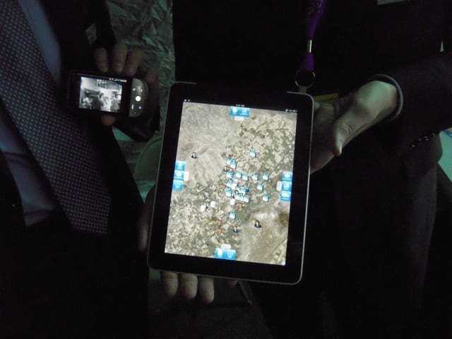 Η εικόνα αυτή είναι ένα iPad υπαλλήλου της Textron Systems που δείχνει έναν χάρτη με τις θέσεις φίλιων και εχθρών — τα μπλε σπίτια είναι στρατεύματα των ΗΠΑ — που οι στρατιώτες θα έχουν στο πεδίο μάχη και θα στέλνουν πίσω σε Σημεία Διοίκησης για ενημέρωση. Τρέχει μέσα από το SoldierEyes, μια ασφαλή cloud τοποθεσία που έχει αναπτυχθεί από δύο θυγατρικές της Textron, την Overwatch και την AAI.