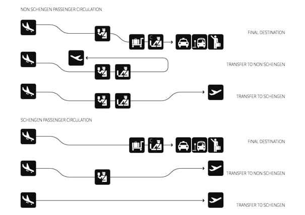 Τα τμήματα στις Βόρειες και Νότιες ακμές του κτιρίου προεξέχουν από το κύριο terminal δημιουργώντας εναλλακτικές πύλες για τις Schengen ή Μη-Schengen πτήσεις που θα φτάνουν…