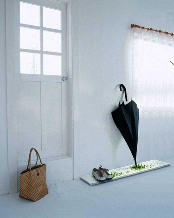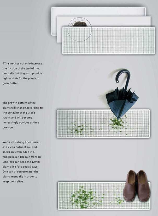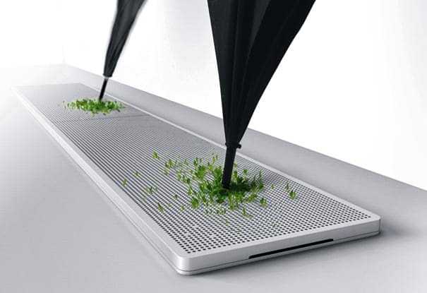 Λοιπόν… Το Green Trace project είναι το εξής: Ένα σταντ για ομπρέλες πωλείται με ένα δίχτυ στο κάτω μέρος και έτοιμους… σπόρους! Ακουμπάς την βρεμμένη ομπρέλα και, όπως είναι φυσιολογικό, νερό τρέχει από το ύφασμα της που φυσικά… ποτίζει τους καρπούς. Πραγματικά ωραίο. Οργανικοdesignάτο!
