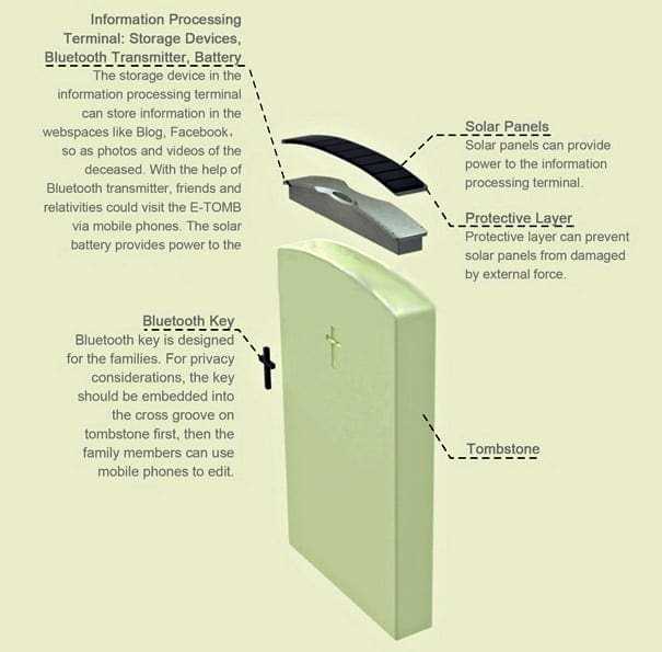 Από την άλλη για άτομα που ξοδεύουν ατελείωτες ώρες για tweeting, Facebook-ing και blogging η ίδεα μια ψηφιακής ‘ταφόπλακας’ με Bluetooth και φωτοβολταϊκά panels που αποθηκεύει τα logs κάποιου είναι κάτι που θα υλοποιηθεί σίγουρα στο μέλλον…