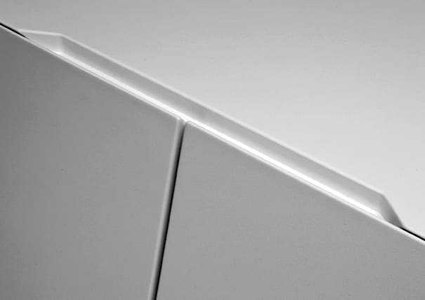Το ίδιο όμορφο και το χερούλι στο πάνω μέρος των επιφανειών από MDF ενώ πραγματικά σύγχρονος και πολύ hi tech είναι ο μηχανισμός για να ανοίγει και να κλείνει το ντουλάπι…