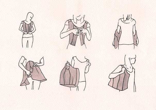 Όσο λοιπόν ζεσταίνει η ημέρα τα επιπλέον τμήματα του ρουχισμού απλά μπαίνουν ΜΕΣΑ στη τσάντα. Βολικό! Η ιδέα ήρθε στη Lewinsohn όταν ήταν στο μανάβικο και σκεφτόταν πως θα μεταφέρει τα ψώνια αφήνοντας στην άκρη την… αντιοικολογική πλαστική σακούλα. Η τρίτη λύση; αυτή που σχεδίασε η ίδια η Lewinsohn…