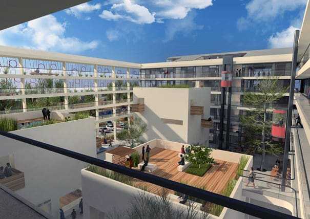Σε έναν πολύβουο δρόμο στην αφρικανική πόλη το κτίριο έχει κήπους γύρω, υπόγειο πάρκινγκ, καταστήματα και καφέ στο ισόγειο, όπως και γραφεία στους ανώτερους.