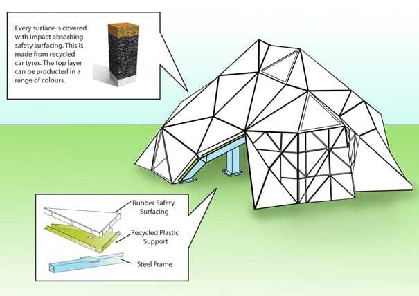 Κάθε ένα από τα τεμάχια αποτελείται από έναν ατσάλινο σκελετό, ανακυκλωμένα πλαστικά και επιφάνειες ασφαλείς για τα παιδιά που είναι καλυμένες από παλιά ελαστικά. Το σετ αυτό δημιουργεί μια τεράστια ασφαλή επιφάνεια για τα παιδιά…