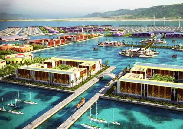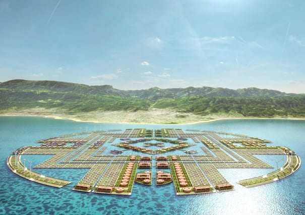 Το όλο project έχει τέσσερις ζώνες με κοινότητες συνδεδεμένες σε ένα γραμμικό σύστημα από κανάλια. Κάθε ένα από τα κανάλια εστιάζει στην γειτονιά που έχει δίπλα του με κτίρια που έχουν τέσσερα πατώματα. Σε όλη την εξωτερική περίμετρο υπάρχουν πόλης για αγροτική εκμετάλλευση “ενός εκταρίου” με δευτερεύοντα κανάλια. Το εσωτερικό ‘λιμάνι’ έχει τα σχολεία, τα κτίρια διοίκησης και την γενική αγορά. Όλο το συγκρότημα επιπλέει με καλώδια που έχουν δεθεί στον πάτο της θάλασσας!