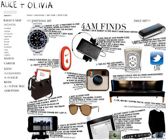 Η Alice + Olivia, είναι μια φίρμα στην οποία αρέσουν τα κοινωνικά πειράματα και διασταύρωσε τεχνολογία και μόδα με την blog στήλη της 4AM Finds. Παρόμοιο με αφιερώματα που βρίσκει κανείς σε περιοδικά όπως InStyle και Vanity Fair, ένας φιλοξενούμενος συγγραφέας βρίσκει αντικείμενα που είναι ‘καυτά’. Φυσικά μερικά προϊόντα two Alice + Olivia είναι στρατηγικά ενσωματωμένα. Το 4AM έχει και φρέσκο τρόπο να παρουσιάζει με περιεχόμενο όπως τα περιοδικά.