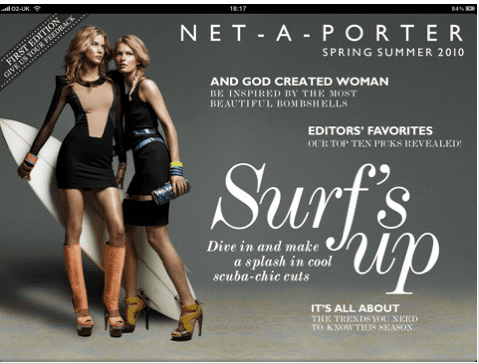 Η app τους Net-A-Porter Magazine για iPad και iPhone είναι από τις πιο όμορφες υλοποιήσεις branded content για φορητή πλατφόρμα. Από τις καλύτερες shopping mobile apps διαθέσιμες η Net-A-Porter app, επιτρέπει σε χρήστες να δουν αποκλειστικό βίντεο περιεχόμενο όπως συνεντεύξεις, πασαρέλες και άλλα. Το περιεχόμενο είναι σημαντικό αφού όπως λέει ο κος Hamilton South, του HL Group, εταιρία στρατηγικών συμβούλων marketing και media “οι καλύτερες media και branded content λύσεις έχουν σαν βάση τη διήγηση και όχι το εμπόριο και η Net-A-Porter iPad app πρέπει να διορθώσει το ότι είναι βασισμένη στην συναλλαγή.”