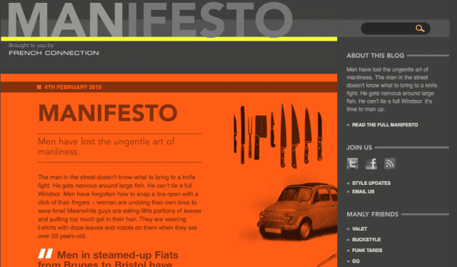 Marketing για άντρες. Η εταιρία French Connection το κάνει σταθερά με το ανδρικό Manifesto. Αυτό το χρόνο και το FCUK Man και το Manifesto έχουν κερδίσει μια θέση στα top five style blogs για άνδρες στο διαδίκτυο. Αυτό που κάνει Manifesto πετυχημένο είναι ο τρόπος που ‘μιλά’ στους Gen Y πελάτες, από τα γραφικά μέχρι το εύκολο στην ανάγνωσηg format.