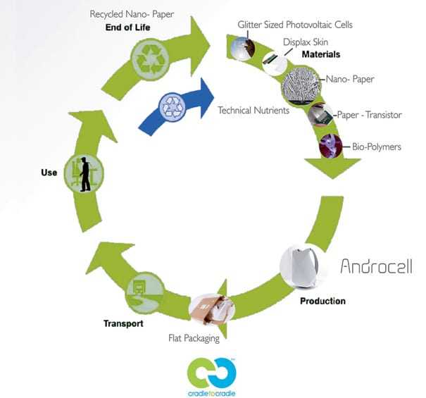 Με ένα Androcell backpack μπορεί να ανταλλάξεις, να αποθηκεύσεις, να δημιουργήσεις και να δεις ψηφιακά δεδομένα. Τα υλικά είναι πρωτοποριακά και οργανικά. Στο τέλος δε της ‘ζωής’ του σακιδίου το Androcell αφήνει μόνο βιοδιασπώμενα απορρίμματα και… θρεπτικά στοιχεία!
