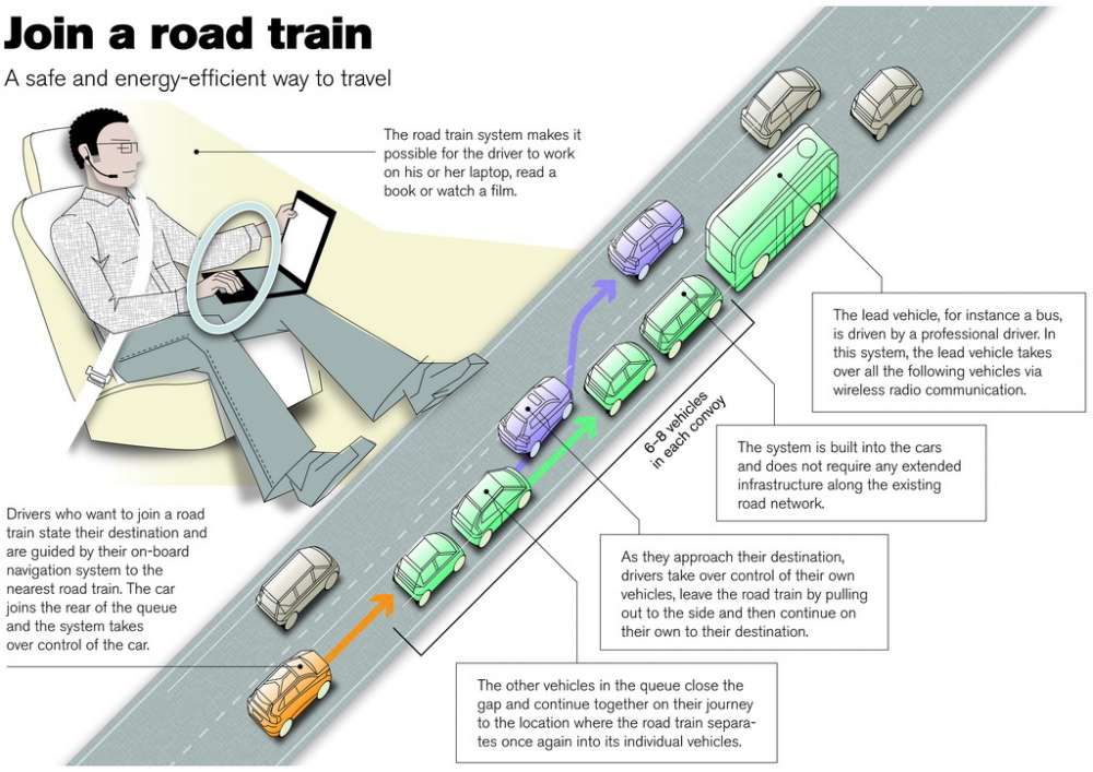 Θα σχηματίζεται λοιπόν ένα ‘τρένο’ από αυτοκίνητα που θα είναι κάτω από τον ‘έλεγχο’ του οδηγού του πρώτου στη σειρά οχήματος, μια λύση αυτό μπορεί να οδηγήσει σε πραγματικά τεράστιες οικονομίες καυσίμου, να βελτιώσει απίστευτα την ασφάλεια στους δρόμους και ταυτόχρονα μειώνει τη συμφόρηση στο δίκτυο.