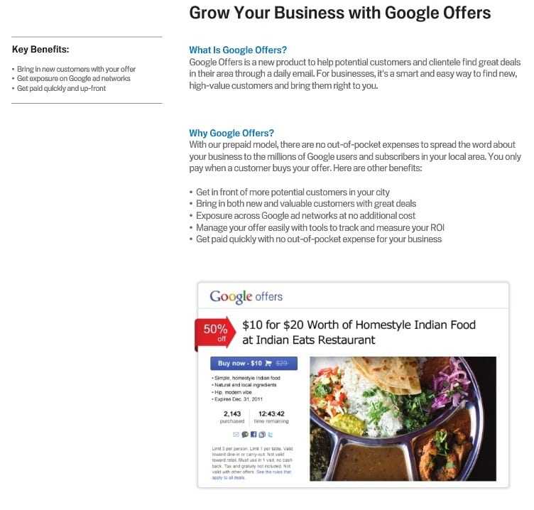 Το Google Offers δείχνει και λειτουργεί όπως τα Groupon και LivingSocial. Οι χρήστες λαμβάνουν ένα e-mail με τις τοπικές προσφορές και τα τοπικά deal-of-the-day. Σε συγκεκριμένο χρόνο μπορούν να αποκτήσουν τη προσφορά και όταν αρκετοί την έχουν επιλέξει τότε θα λάβουν έκπτωση για την αγαπημένη τους taverna…