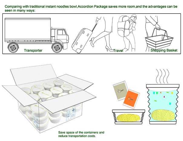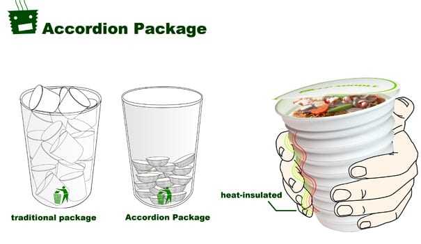 Το Accordion Package είναι ένα δοχείο που έχει σαν στόχο να μας κάνει να γλυτώσουμε χώρο σε ελάχιστο χρόνο. Πολύ απλά και… όμορφα σαν ένα ακορντεόν συμπιέζεται και είναι πιο εύκολο να αποθηκεύσεις και να κουβαλήσεις κάτι με μείωση του κόστους μεταφοράς. Η επιφάνεια έχει και λιγότερα σημεία από τα οποία θα μπορούσαμε ίσως να καούμε. Τελείωσε με τις τηγανιτές πατάτες και συμπίεσε για να μην γεμίζει η σακούλα απορριμμάτων. Απλό.