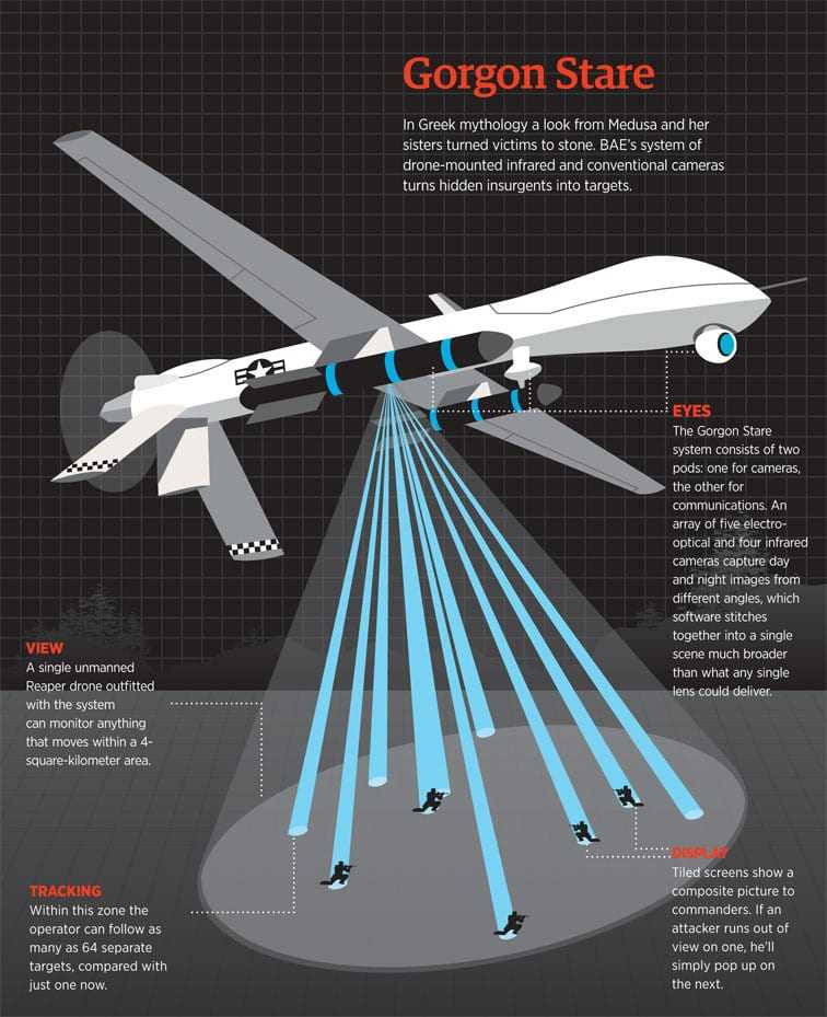 Το Gorgon Stare και άλλα προγράμματα ευρείας παρακολούθησης – “wide-area airborne surveillance” (WAAS) systems – βγήκαν από την ανάγκη στον πόλεμο του Ιράκ να ανιχνεύονται αυτοκίνητα-βόμβες σε όλη την πόλη. Και όταν μιλάμε για ολόκληρη πόλη μιλάμε για περισσότερα από 150 στρέμματα με μια ‘ματιά…’