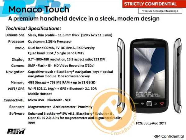 Μετά θα δούμε και έκδοση CDMA του Apollo με ονομασία Sedona, ένα νέας γενιάς Curve με υποστήριξη για δίκτυα NFC – αυτό το φθινόπωρο. Τέλος νωρίς το 2012 αναμένεται μια συσκευή με κωδική ονομασία Malibu (…Monaco, Malibu, θέλω διακοπές! ) που μοιάζει με ένα Curve Touch με πλήρη οθόνη και κάπως χειρότερα χαρακτηριστικά από το Μonaco…