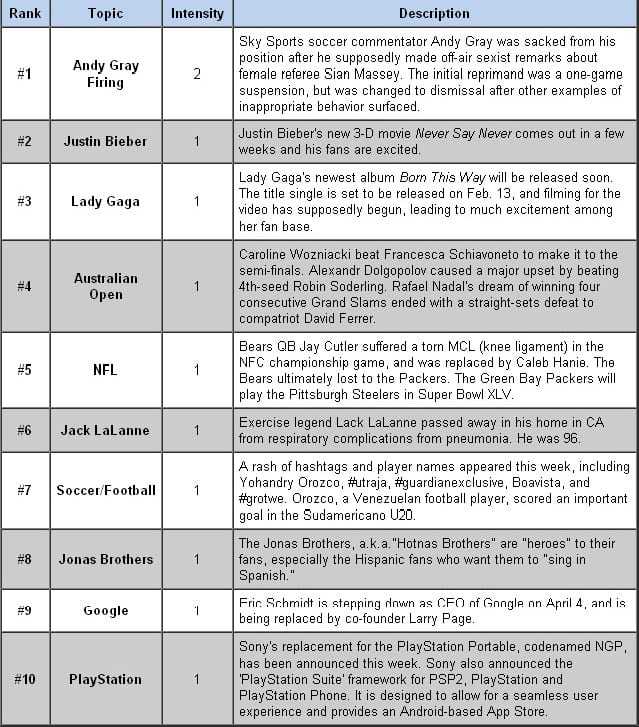 Λίγο από όλα στα Twitter trends την εβδομάδα που μας πέρασε: τα σπορ έχουν μια πολύ δυνατή παρουσία αφού κορυφαία τάση σε αυτό το site κοινωνικής δικτύωσης είναι η… απόλυση του αθλητικού σχολιαστή Andy Gray στη Σκωτία, όταν έκανε σεξιστικά σχόλια στον αέρα!