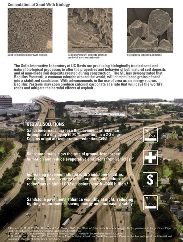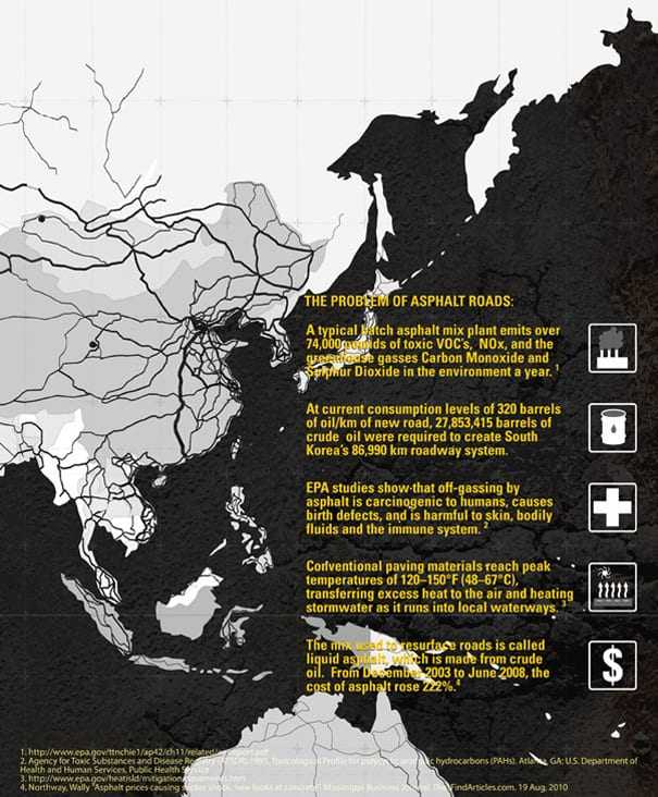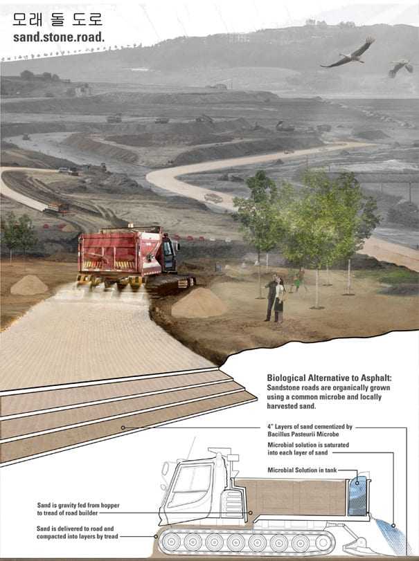 Ταυτόχρονα – όπως μας λέει η Κορεάτης σχεδιαστής – 28.000.000 βαρέλια απαιτήθηκαν για 86.990 χιλιόμετρα δρόμων στη Νότιο Κορέα! Το σχέδιο Sand Stone Road προτείνει τη χρήση μιας οργανικής διαδικασίας για να φτιάχνουμε δρόμους και είναι ΤΕΛΕΙΟ: γιατί δηλαδή να έχει άσφαλτο μέχρι το αγαπημένο σου beach bar;