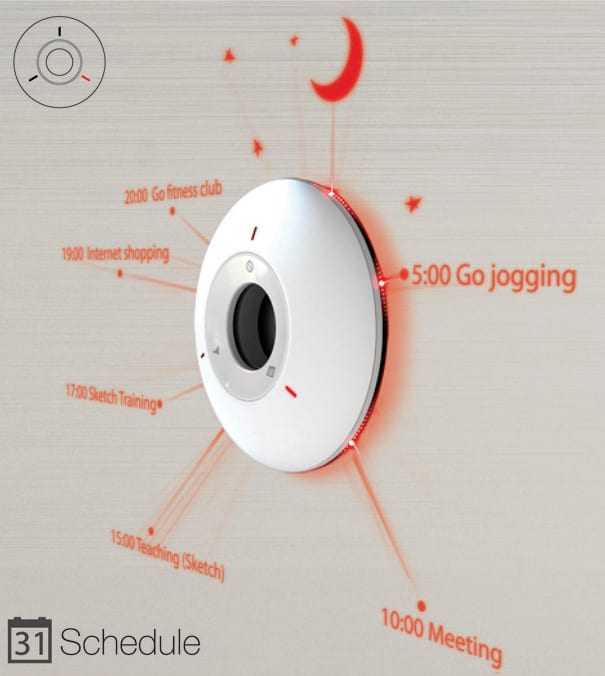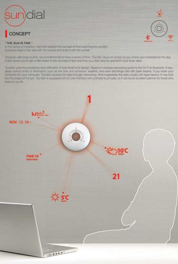 The usual task of a wall clock is to indicate time and at the least, look pretty. What if we were to add laser beams, touchpad UI, WiFi, bluetooth and computer syncing? Now wouldn’t that be a rocking concept! The proposed Sundial is all of the aforementioned; a cool device on the wall that will beam you the weather, your appointments for the day, stock markets and whatever else you please!
