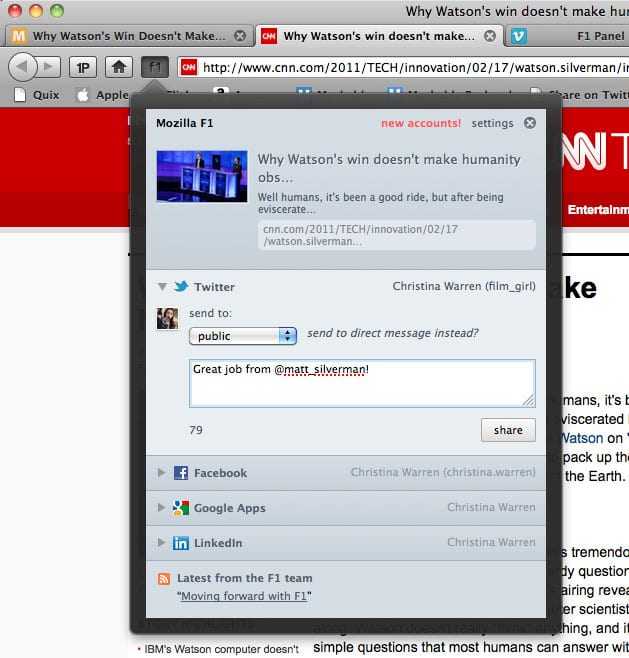 Μια αναβαθμισμένη έκδοση του F1 browsing extension ανακοίνωσε η Mozilla. Το F1 το έχει ετοιμάσει η ομάδα Mozilla Messaging και είναι σχεδιασμένο για να διευκολύνει το sharing των links σε διάφορες υπηρεσίες κοινωνικής δικτύωσης. Αντί να πρέπει να βασιστείς στα κουμπιά “share this” σε μια σελίδα web, ο χρήστης μπορεί να χτυπήσει το F1 στο πληκτρολόγιο και να επιλέξει την υπηρεσία που θέλει να χρησιμοποιήσει.