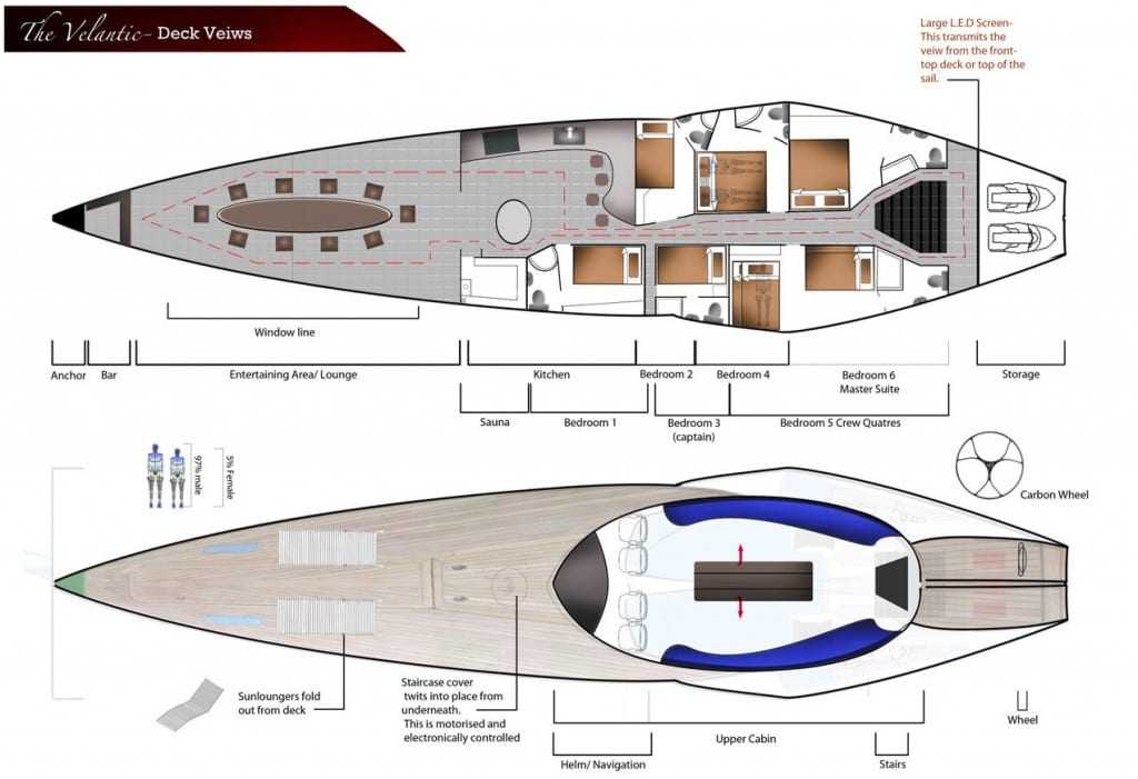 Στην πραγματικότητα είναι ένας συνδυασμός σκάφους, κανονικού ιστιοπλοϊκού και “power cruiser” με ένα ιδιαίτερα λειτουργικό σύστημα ‘πανιών’ που επιτρέπει στην όλη ιδέα να μεταμορφώνεται ώστε να υπάρχει η μέγιστη χρηστικότητα και ‘οικολογική’ ταυτότητα. Ο βασικός σκοπός του σχεδιασμού είναι η δημιουργία ενός σκάφους μεταφοράς που να είναι αισθητικά όμορφο και ταυτόχρονα με πολλά eco-friendly χαρακτηριστικά. Αν είσαι ένας hedgefunder και το.. ποθείς πάντως, έχει και άνεση με 6 πλήρη, πολυτελή υπνοδωμάτια, δωμάτιο ψυχαγωγίας, bar, σάουνα, κουζίνα και άλλα στοιχεία για να μας μείνει… αξέχαστη η εμπειρία! Και hi tech και… οικολόγος! Τυχερός ιδιοκτήτης…
