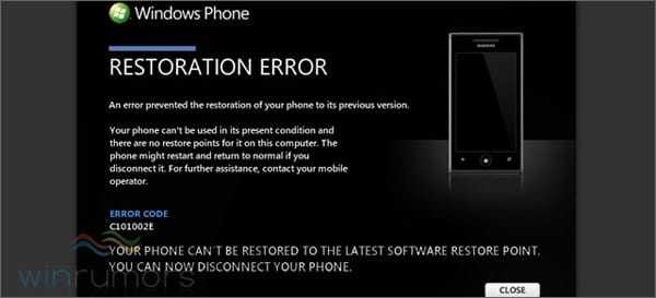 Προσπάθειες για hard reset δεν βοηθούν με τη Windows Phone 7 PC recovery suite να γράφει ένα “Restoration Error”. Η Microsoft συμβουλεύει τους χρήστες με το πρόβλημα να δώσουν το κολλημένο κινητό για ένα καινούργιο.