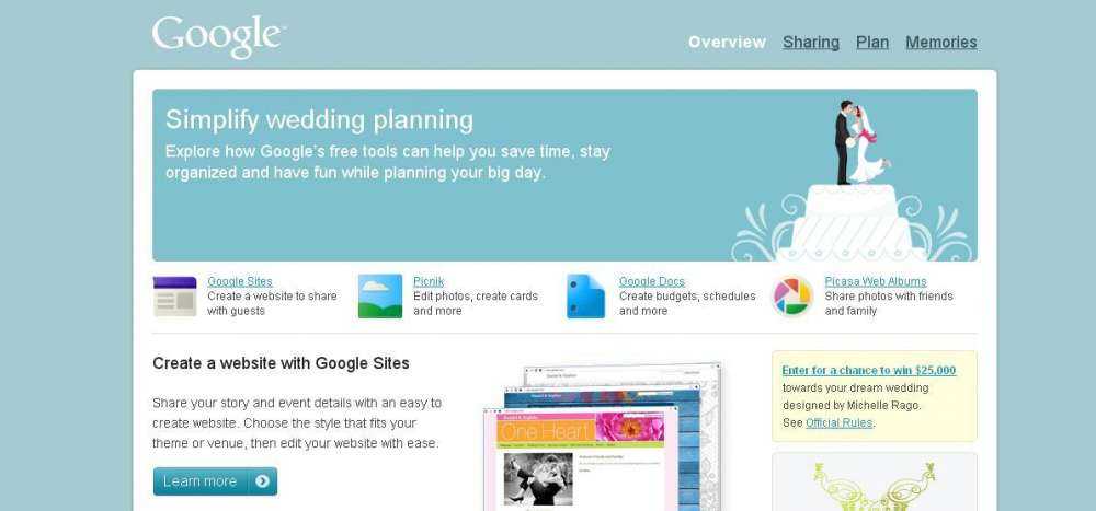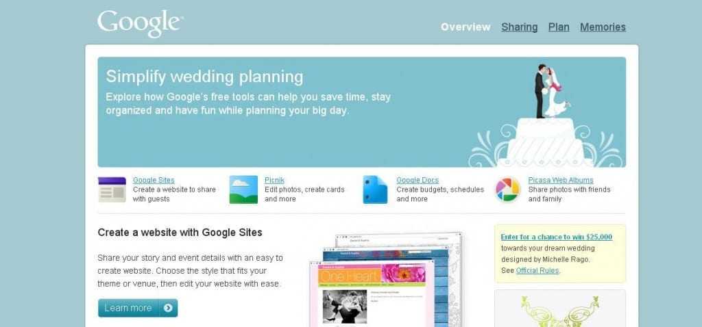 Αμέσως μετά την ημέρα του Αγίου Βαλεντίνου, η Google φαίνεται πως είναι αισιόδοξη για την πορεία των ερωτικών συνευρέσεων και ετοίμασε ειδικό site όπου οι καταναλωτές θα δημιουργήσουν ειδικό website γάμου. Εδώ μπορεί να κάνεις edit σε φωτογραφίες, να σχεδιάσουν τον γάμο τους με ειδικά templates για Google Sites, Google Docs και Picnik. Η εταιρία το ανακοίνωσε στο επίσημο Google blog.