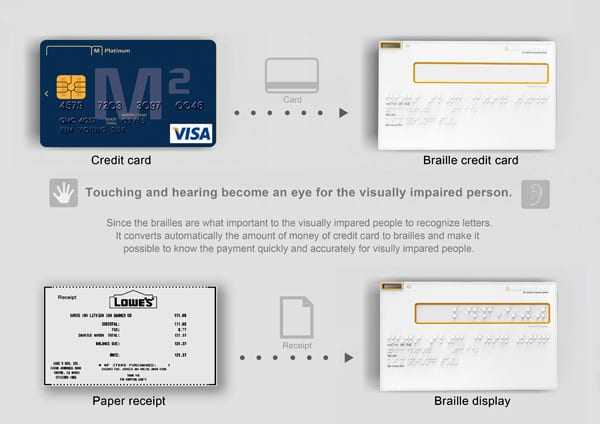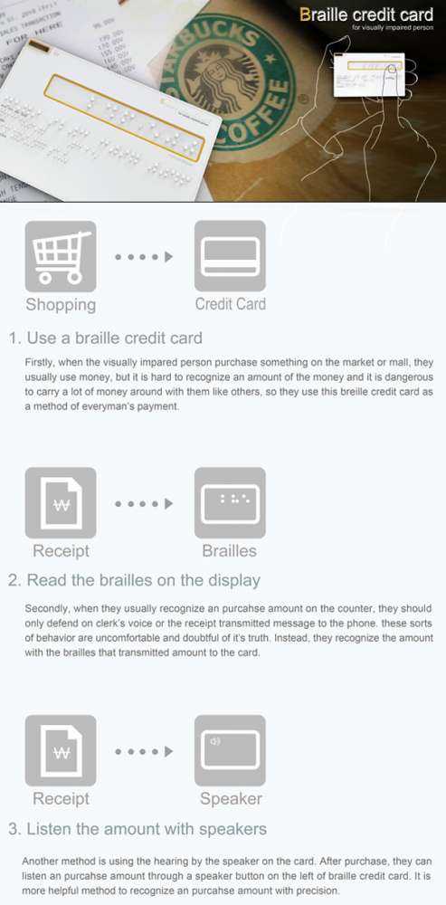Η πιστωτική κάρτα Braille Credit Card είναι μια νέα έκδοση της προηγούμενης ιδέας Blind CC από άλλον σχεδιαστή. Πιο εύκολη στη μεταφορά από την άλλη σχεδίαση και παρόμοια σε χρήση με μια ‘κανονική’ πιστωτική κάρτα. Δείχνει τη συναλλαγή γραφή braille και κάνει την επιβεβαίωση με ηχητικό μήνυμα. Υπάρχουν και τρόποι υπολογισμών αλλά και μετατροπής συναλλάγματος. Πρακτικό και αναγκαίο θα πούμε…