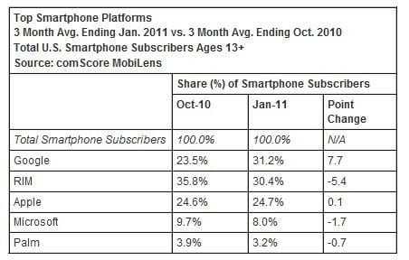 Σύμφωνα με κάποια στατιστικά από την ComScore, φαίνεται τα Windows Phone 7 να μην βοηθούν τη Microsoft στον πόλεμο των smartphone. Η εταιρία κατάφερε ένα μάλλον άσχημο 1.7% της αγοράς στις ΗΠΑ από τον Οκτώβριο μέχρι την Ιανουάριο – περίοδος όπου τα WP7, το νέο λειτουργικό, μπήκε στην αγορά.