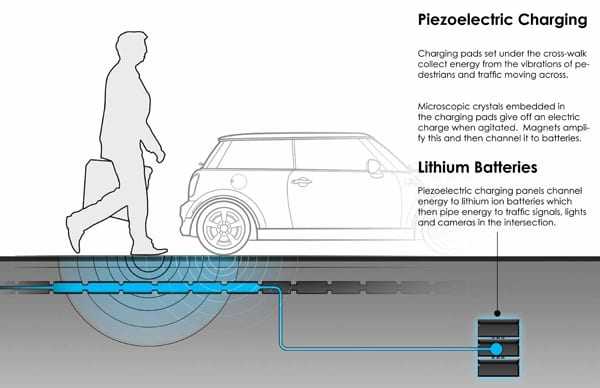 Κραδασμοί που μετατρέπονται σε ηλεκτρική ενέργεια και άρα λεωφόροι που θα μπορούν να τροφοδοτήσουν με ρεύμα π.χ τα φανάρια. Πιεζοηλεκτρικές πλάκες έχουν τοποθετηθεί κάτω από τις διαβάσεις μετατρέπουν τους κραδασμούς όχι μόνο των πεζών αλλά και των αυτοκινήτων σε ενέργεια και έτσι οι λάμπες των δρόμων, οι κάμερες, τα φανάρια ακόμη και λοιπές ηλεκτρονικές συσκευές που βρίσκονται στην περιοχή δεν χρειάζονται πλέον παροχή από το δίκτυο.