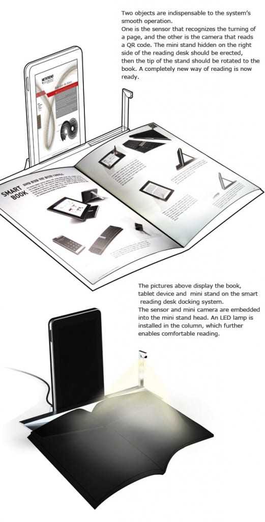 Το Smart Bookrest Docking System ελπίζει να γεφυρώσει το κενό ανάμεσα στους δύο κόσμους. Δουλεύει με το διάβασμα ενός κώδικα QR που είναι τυπωμένος σε μια σελίδα. Στη συνέχεια τα σχετικά media θα εμφανιστούν στο tablet. Καλό…