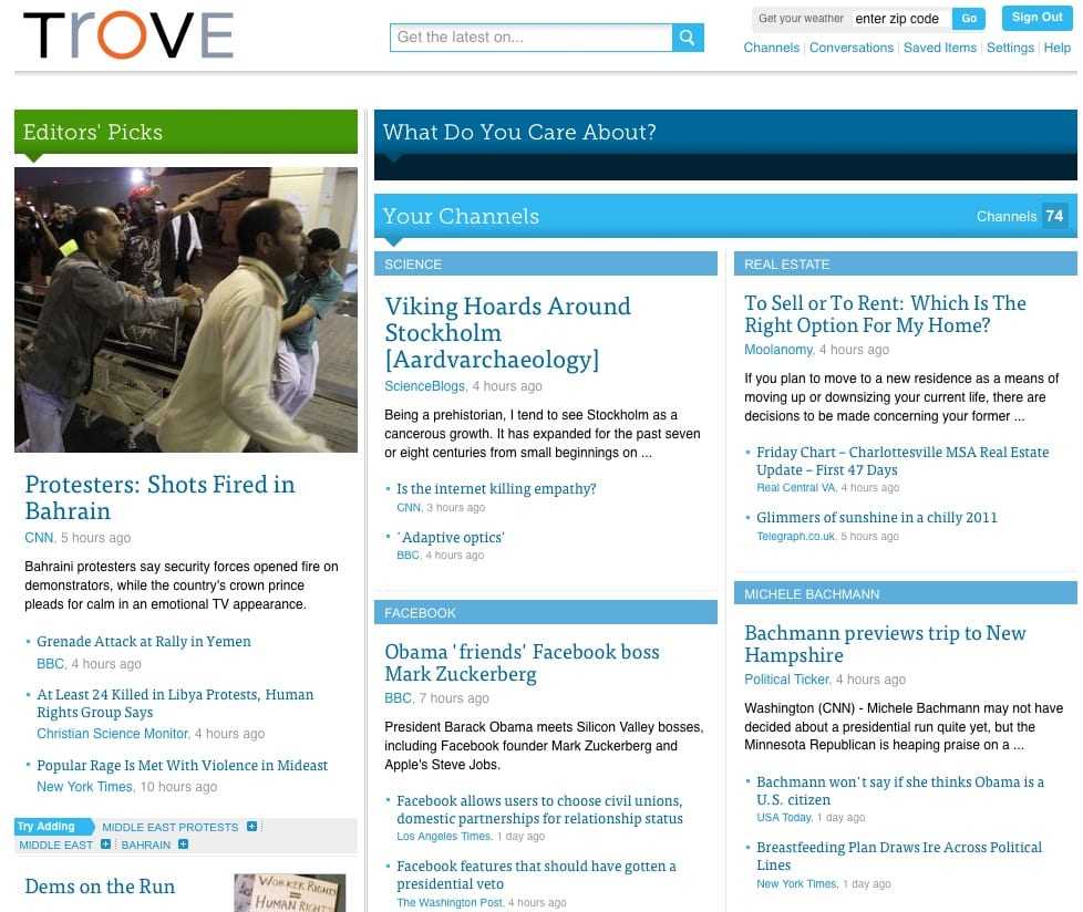 Το συγκεκριμένο site πρωτοαναφέρθηκε πως είναι σε εξέλιξη και ετοιμάζεται για λανσάρισμα από την The Wall Street Journal τον Φεβρουάριο του 2011. Το Trove συγκεντρώνει νέα που ενδιαφέρουν τον χρήση και τα σημαντικά πρωτοσέλιδα της ημέρα από 10.000 (!) πηγές.