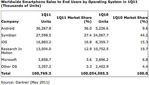 Κάπου 36.27 εκατομμύρια Android συσκευές έφυγαν σε αγορές το πρώτο τρίμηνο του 2011 και έτσι το λειτουργικό με το μικρό πράσινο ανθρωπάκι έφτασε το 36% , περισσότερο από το τριπλάσιο μερίδιο από αυτό του 2010. Εν τω μεταξύ η Microsoft έπιασε μόλις το 3.6% από το 6.8% που είχε πριν από έναν χρόνο και τα Windows Phone έκαναν ελάχιστη ‘δουλειά’ αφού η εταιρία είχε μόλις 3.66 εκατομμύρια μονάδες από τις οποίες τα 1.6 εκατομμύρια ήταν νέο λειτουργικό Windows Phone.