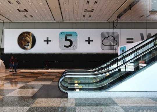 Είναι η περιοχή Moscone West στο San Francisco και είδαν σηματοδότηση της εταιρίας από το Cupertino κατά τις προετοιμασίες για το event της ερχόμενης Δευτέρας. Το τεράστιο πόστερ δείχνει ένα Λιοντάρι (for OS X Lion), τον αριθμό 5 (για το iOS 5) και το περίγραμμα ενός σύννεφου (μοιάζει με το MobileMe cloud logo). Στην γυαλιστερή επιφάνεια και ένα άλλο logo που θυμίζει την επερχόμενη υπηρεσία της Apple, το cloud σύστημα iCloud.