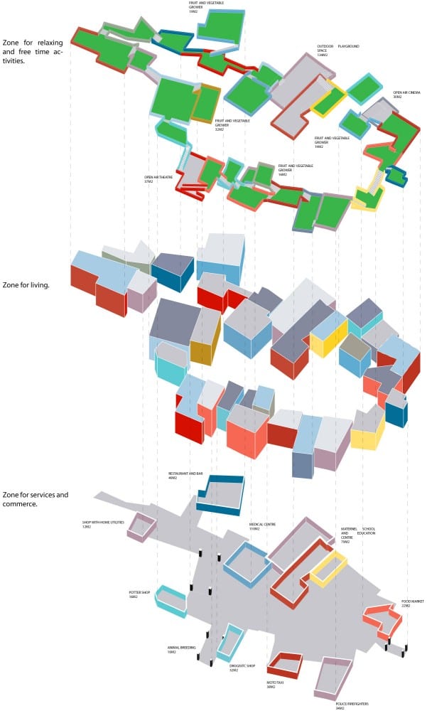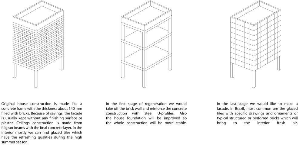 Η διαδικασία της αναγέννησης έχει σαν στόχο και βασικό άξονα να ‘ανέβουν’ έναν όροφο όλα τα οικήματα και στο ισόγειο να υπάρχουν εμπορικοί χώροι ενώ η αρχική κατασκευή με τσιμέντο θα αλλαχτεί πλήρως και θα τοποθετηθούν ατσάλινα u-προφίλ με ενισχυμένα θεμέλια και νέα κατασκευή. Αλλάζουν και οι προσόψεις με διάτρητα τούβλα και υαλότουβλα: αέρας και φρεσκάδα στην όψη. Έξυπνο.