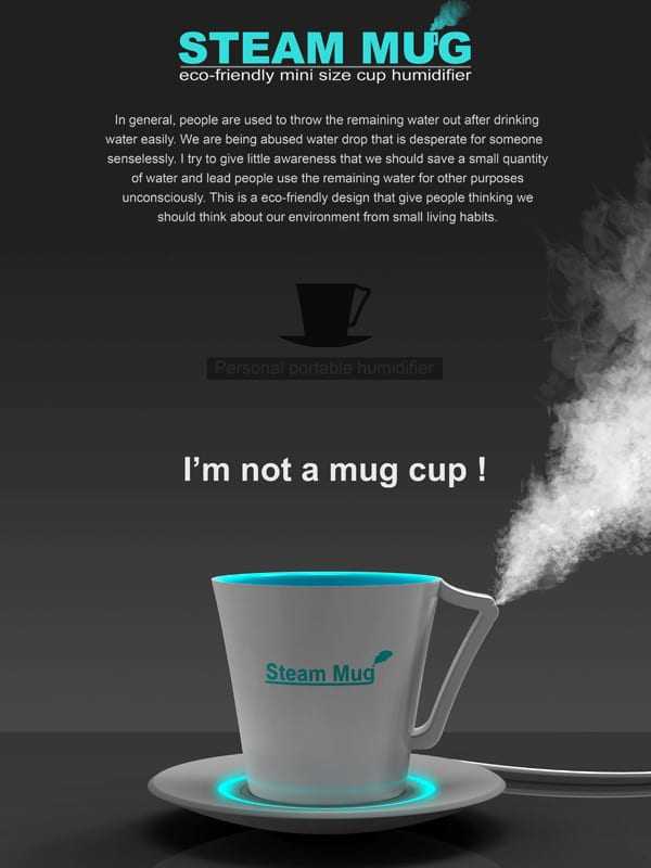 Το Steam Mug είναι ένας συμπαθής υγροποιητής που χρησιμοποιεί το νερό που έχει μείνει από την κούπα του νερού για να δώσει την απαραίτητη υγρασία στο δωμάτιο. Μπορεί να δουλέψει με μικρές ποσότητες νερού και είναι αρκετά cool για να το έχεις στο γραφείο…
