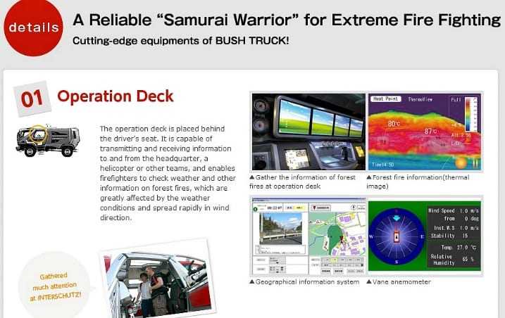 Ένας ιδιαίτερα επικίνδυνος ‘εχθρός’ με βασικό ζητούμενο την επικοινωνία καθώς αυτές οι πυρκαγίες, όπως δυστυχώς το έχουμε βιώσει, μπορούν εύκολα και άμεσα να αλλάξουν κατεύθυνση. Έτσι το όχημα διαθέτει μια σειρά από προηγμένα συστήματα διαχείρισης δεδομένων και επικοινωνιών ενώ επιπλέον για τη ‘μάχη’ με τις φλόγες χρησιμοποιείται και σύστημα ειδικού αφρού κατάσβεσης – compressed air foam system (CAFS) – που έχει αναπτύξει η εταιρία Morita, αφού σε απομακρυσμένες περιοχές το νερό είναι ζήτημα. Με το CAFS, χρειάζεται μικρή ποσότητα νερού για την κατάσβεση.