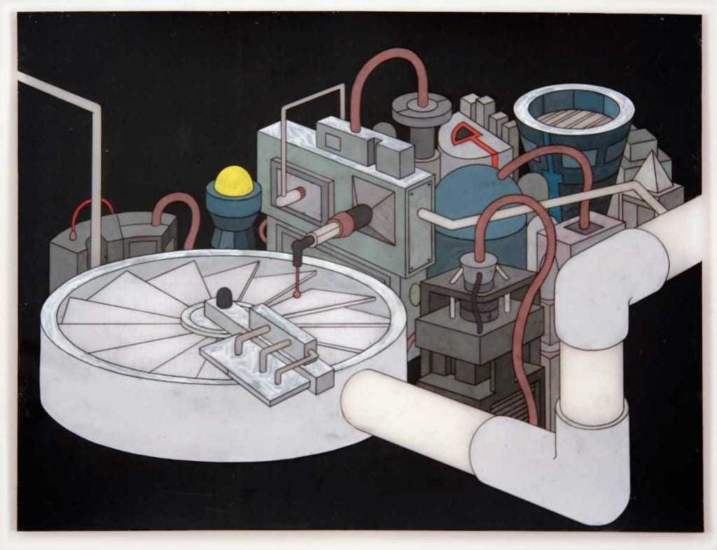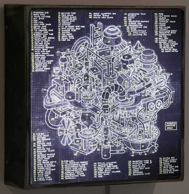 Οι δημιουργίες του Amrhein χαρτογραφούν προσεκτικά τα εσωτερικά πολύπλοκων μηχανών με παράλληλες γραμμές και ιδιότυπα σχήματα: οργανικά σχηματισμένες βαλβίδες, καλώδια ‘φιδίσιου’ σχεδιασμού και λίγο χρώμα σε σημεία.