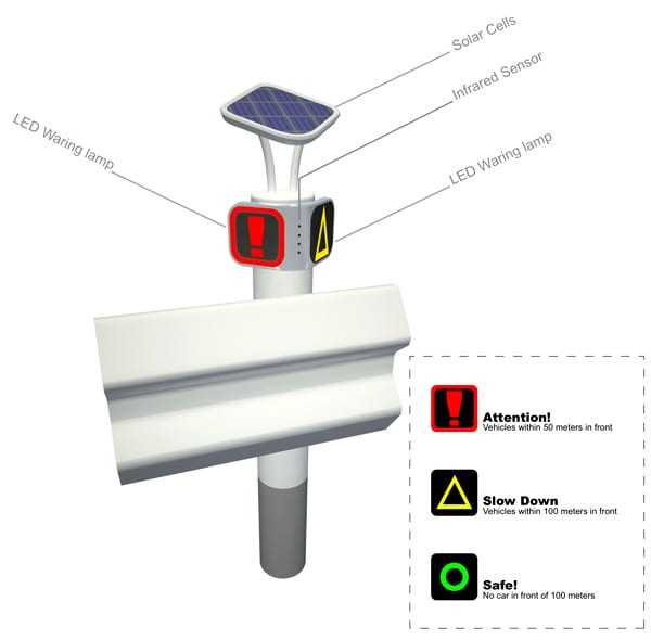 Οι κύλινδροι ανιχνεύουν τα αυτοκίνητα που περνούν και με υπέρυθρους αισθητήρες ενεργοποιούν τις λάμπες προειδοποίησης ενώ ανάλογα με το πόσο κοντά κινείται το ένα αυτοκίνητο με το άλλο, η λάμπα θα φωτίζει από κόκκινη (πολύ κοντά), σε κίτρινη (κοντά) έως και πράσινη (ασφαλής απόσταση),