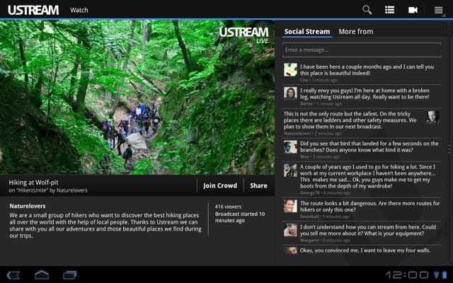 Το Ustream είναι μια app που επιτρέπει σε χρήστες να βλέπουν live βίντεο που έχουν εγγραφεί από άλλα μέλη της κοινότητας Ustream community. Ενώ μπορείς και να ανεβάσεις τς βίντεο σου για streaming online.
