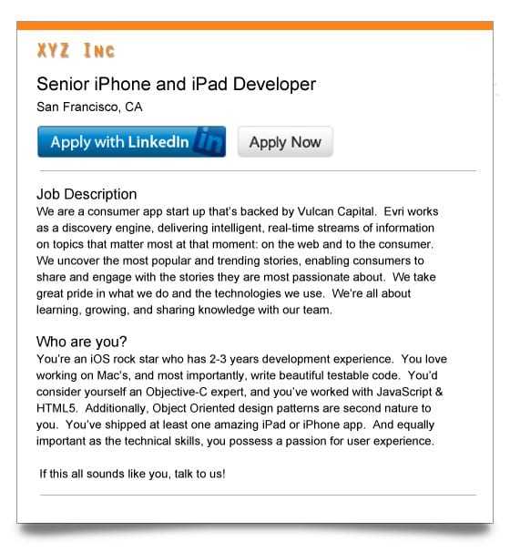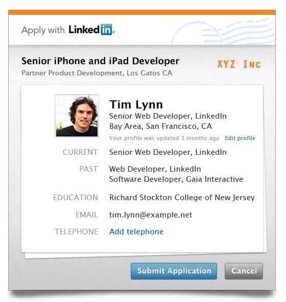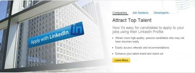 Έτσι έχουμε το κουμπί “Apply with LinkedIn” για site εργοδοτών. Μια εταιρία θα μπορεί με λίγη προγραμματιστική δουλειά να δημοσιεύει θέσεις εργασίας. Εταιρίες δε μπορούν να στήσουν (customize) το κουμπί για να δηλώνεται πως μαζί με το ενδιαφέρον, ο υποψήφιος θα πρέπει π.χ να στείλει και ένα γράμμα ή να απαντήσει σε μια σειρά από ερωτήσεις για το αν είναι κατάλληλος για τη δουλειά.