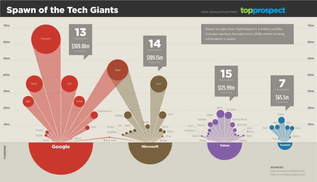 Βασικό συμπέρασμα; πιο δυνατή η Google που έχει ‘γεννήσει’ 13 ιδρυτές εταιριών σε πέντε χρόνια – ίδρυσαν εταιρίες όπως οι Foursquare, Color Qwiki, εταιρίες που έχουν ‘τραβήξει’ μαζί πάνω από $309 εκατομμύρια σε χρηματοδότηση.