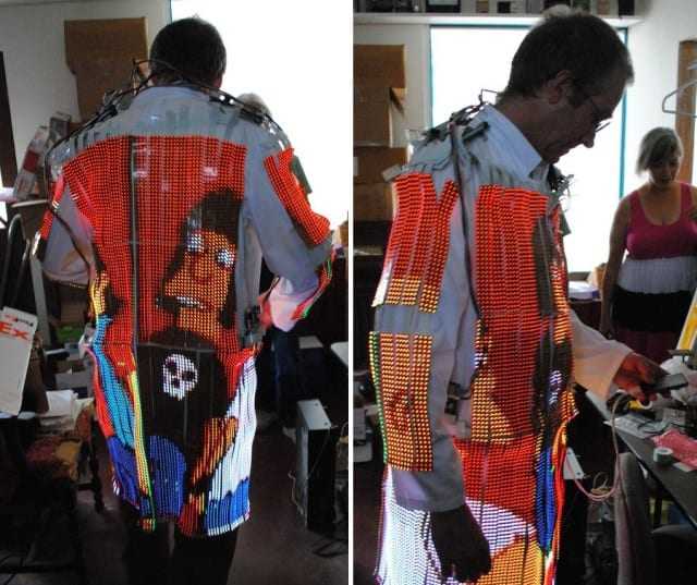 Είναι ένα παλτό γεμάτο με κυκλώματα που παίζει και σήμα από την TV έστω και στα 160×120 (με καλή δυνατότητα και στα resized 320×240). Το PCB είναι εύκαμπτο και δεν χρειάζεται να ανησυχήσει κανείς για το πως θα το φορέσει. Μπαταρίες για μια ώρα και.. πολύ cool!