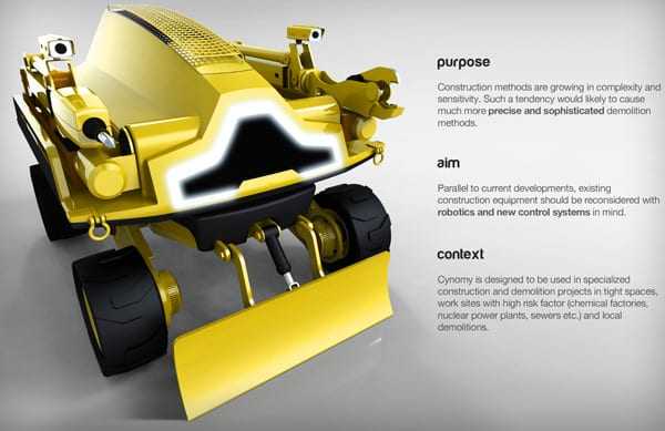 Το όχημα Cynomy demolition vehicle έχει καινοτόμες ιδέες για κατεδαφίσεις και μπορεί να έχει ενσωματωμένα πάνω του πολλά εργαλεία ενώ όλος ο σχεδιασμός είναι βασισμένος σε ρομποτικά συστήματα με ειδικά ηλεκτρικά μοτέρ όπως και λάστιχα χωρίς αέρα.