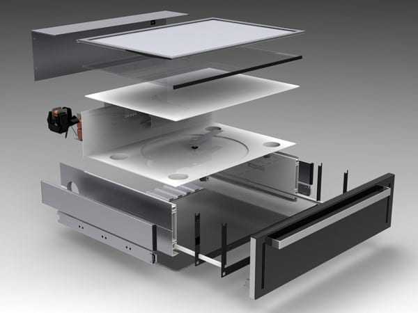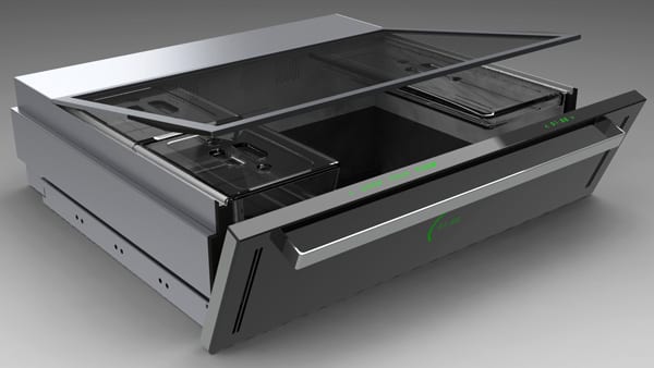 Ένα συρτάρι ουσιαστικά που είναι και πλυντήριο. Με την μπροστινή θύρα να είναι από ατσάλι και να ενσωματώνει τα ηλεκτρονικά. Όλο το σύστημα με χρήση και ειδικού γυαλιού (borosilicate glass) που έχει επιφάνεια αφής για πλοήγηση!