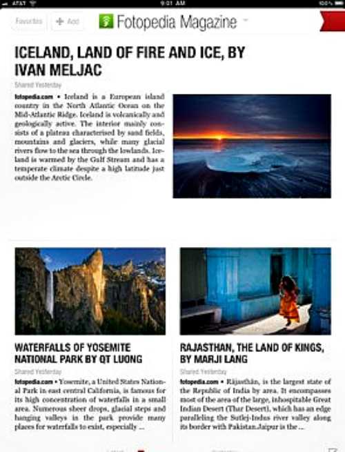 Το The Fotopedia Magazine in Flipboard κάθε ημέρα θα δίνει σημασία σε πέντε δουλειές φωτογραφικές την ημέρα με high-end δουλειές φωτογράφων. Με κείμενα και λεζάντες ουσιαστικά είναι Photo feeds που είναι πολύ δημοφιοή στο Flipboard που δημιουργεί και νέα κανάλι από το @FotopediaMag Twitter feed.