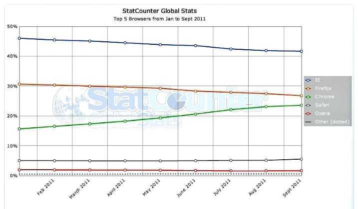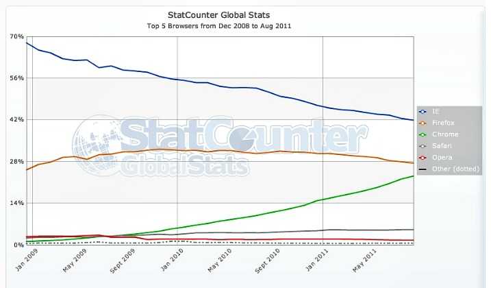 Ο δε Chrome που είναι διαθέσιμος από τον Δεκέμβρη του 2008, έχει αυξήσει το μερίδιο της αγοράς φέτος κατά 8% ενώ ο Firefox έχασε 4% και ο ΙE 9%.