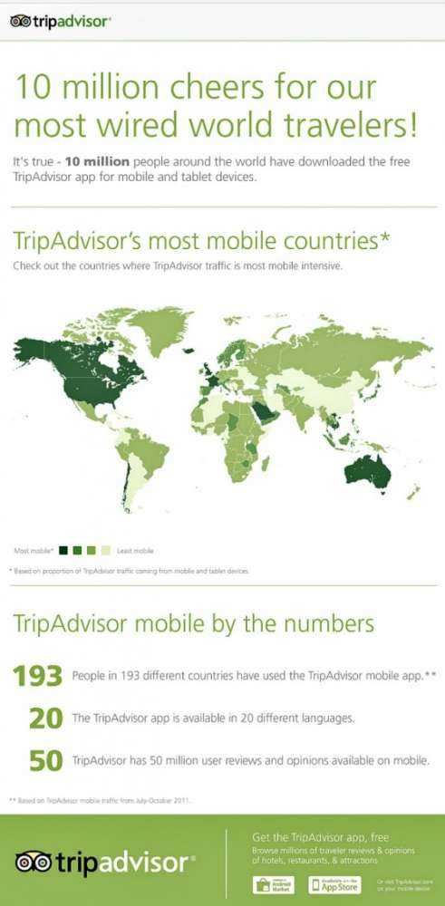 Η iPhone app είναι η No. 4 travel app στο iTunes και αν συμπεριλάβουμε τις mobile web λύσεις είναι οι μισοί mobile users και το TripAdvsor έχει συνολικά ξεπεράσει τα 10 million unique mobile users το μήνα.