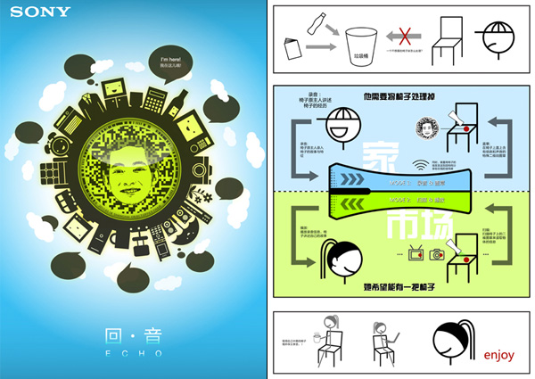 Με αυτά στο νου ο κος Shen Hao Cheng σχεδίασε το Sony Echo, μια συσκευή που εγγράφει την ιστορία ενός προϊόντος από δεύτερο χέρι. Η ιδέα είναι πως όλοι ανακυκλώνουμε τα πράγματά μας είτε έπιπλα είτε gadget και συνδεόμαστε συναισθηματικά με αυτά. Το Echo επιτρέπει να εγγράφεις τον ΄κοινό βίο’ με ένα προϊόν και να έχεις στη συνέχεια την εξιστόρηση της κοινής σου ζωής με αυτό.