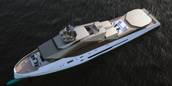 Αντί για τις… στρώσεις από καταστρώματα, έχει μια μονολιθική αντιμετώπιση στον σχεδιασμό με μια εικόνα που μοιάζει με stealth φρεγάτες. Το αποτέλεσμα; μια ξεκάθαρη σχεδίαση, ένα look και κλασικό και μοντέρνο με πολυτέλειες και… χωρητικότητα: υπάρχουν 10 καμπίνες επισκεπτών, πισίνα και χώροι για υποβρύχιο και σκάφη.